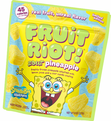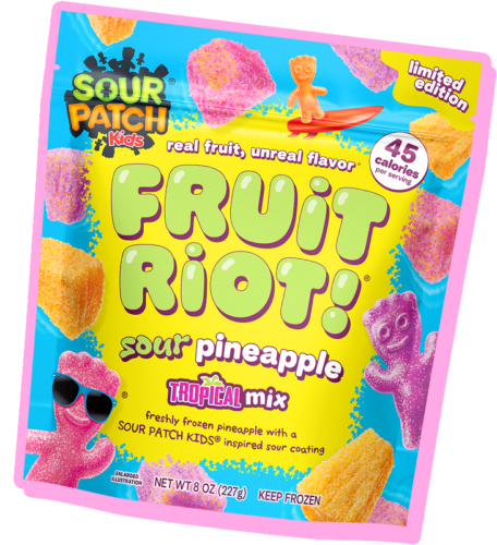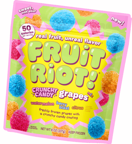 Fruit Riot is freshly frozen fruit splashed with lemon juice & a candy coating.