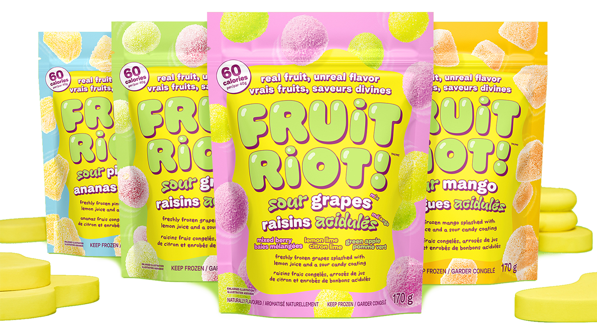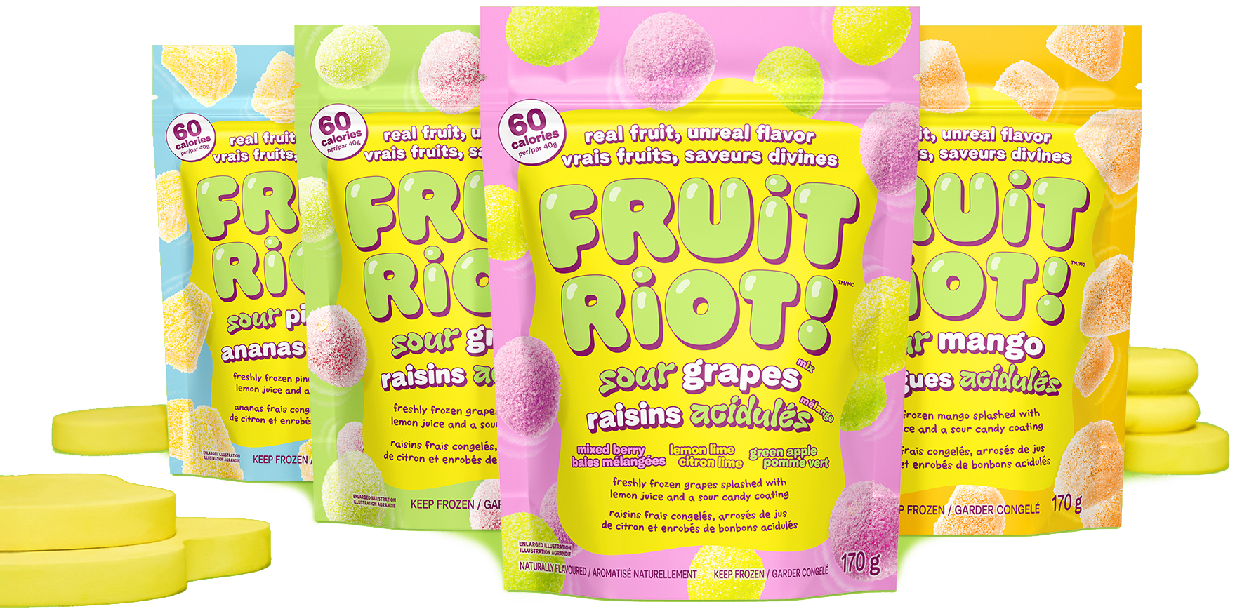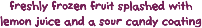 Fruit Riot is freshly frozen fruit splashed with lemon juice & a candy coating.