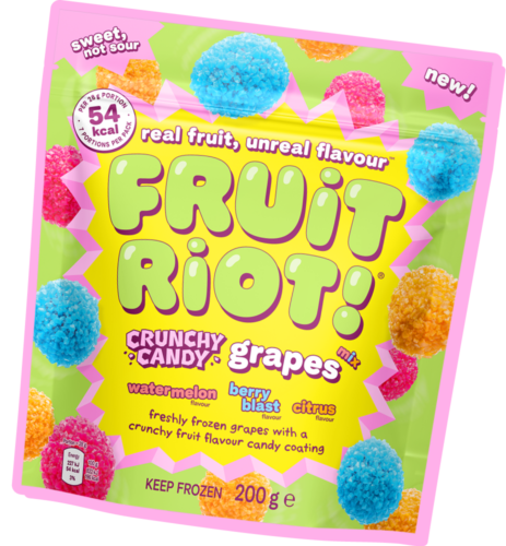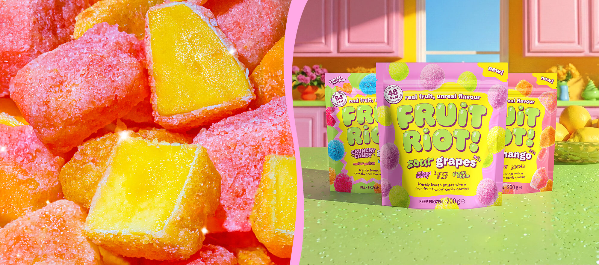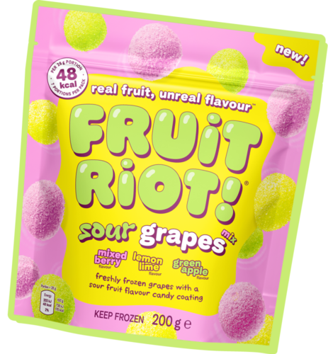 Fruit Riot is freshly frozen fruit splashed with lemon juice & a candy coating.
